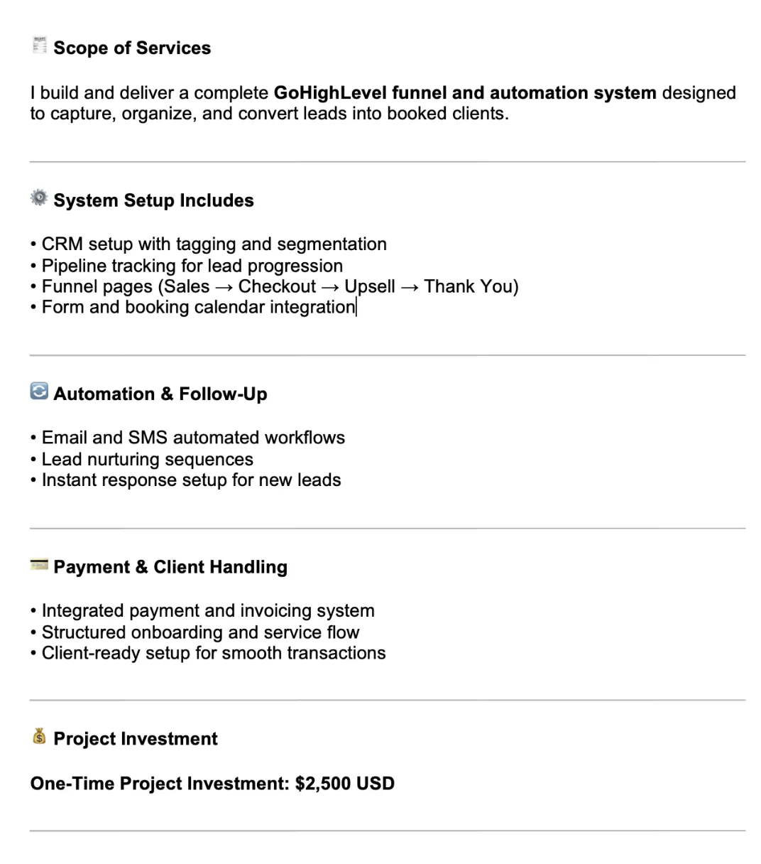 I build GoHighLevel systems that capture every lead, automate follow-ups, and turn them into booked clients.