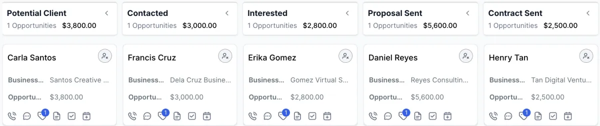 Real examples of funnels, CRM organization, and automated workflows I’ve built to help businesses manage and convert leads.