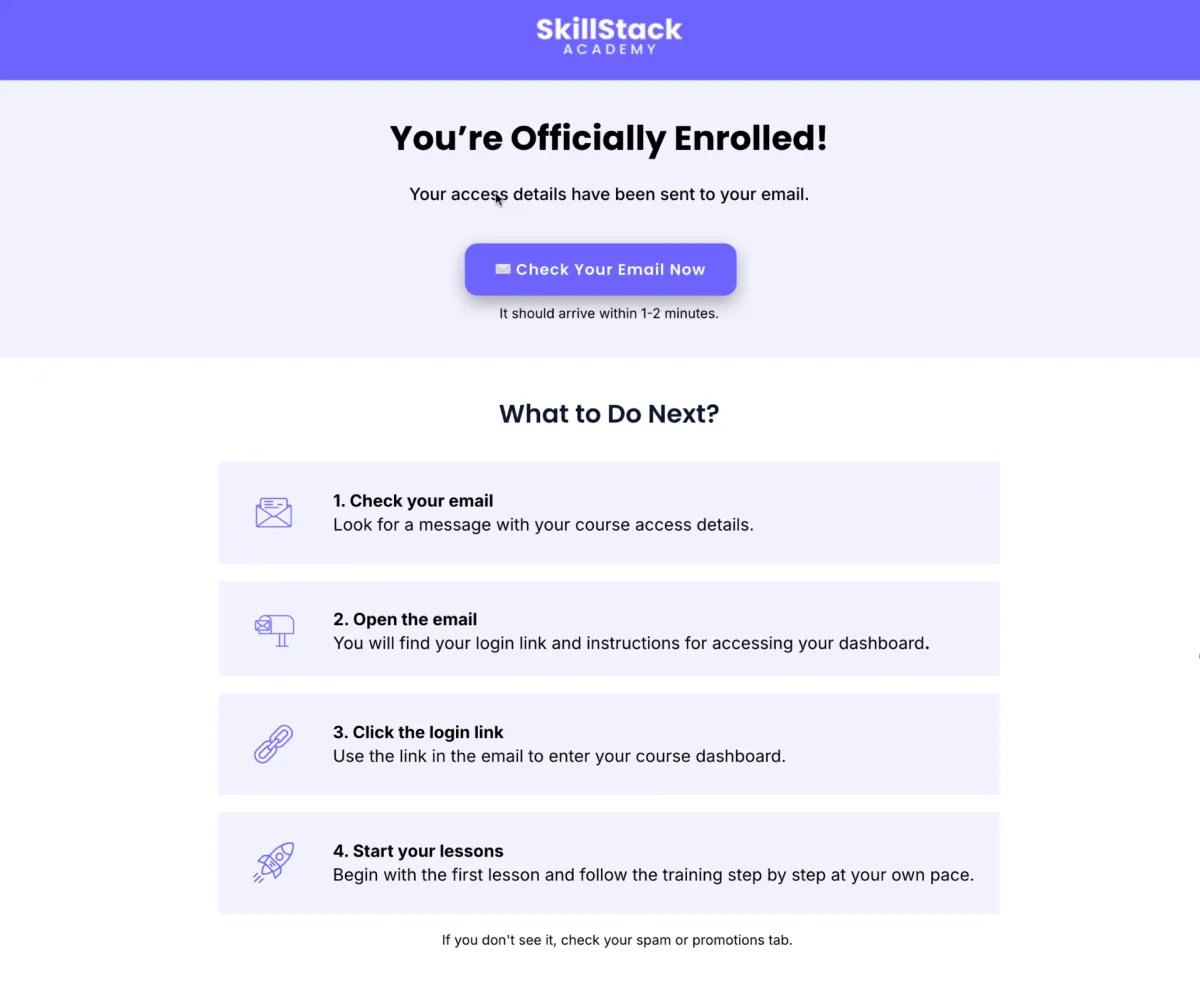 Confirms the purchase and provides clear next steps for the user.