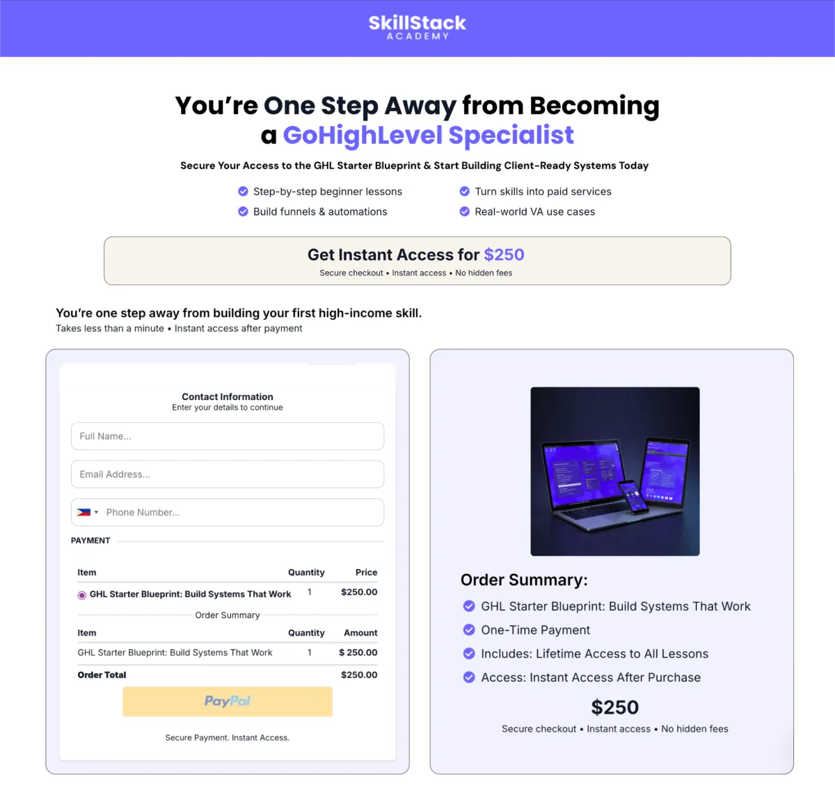 | Funnel Pages | — | 1 funnel (3–4 pages, mobile-optimized) | Funnels (4–6 pages, fully mobile-optimized) |